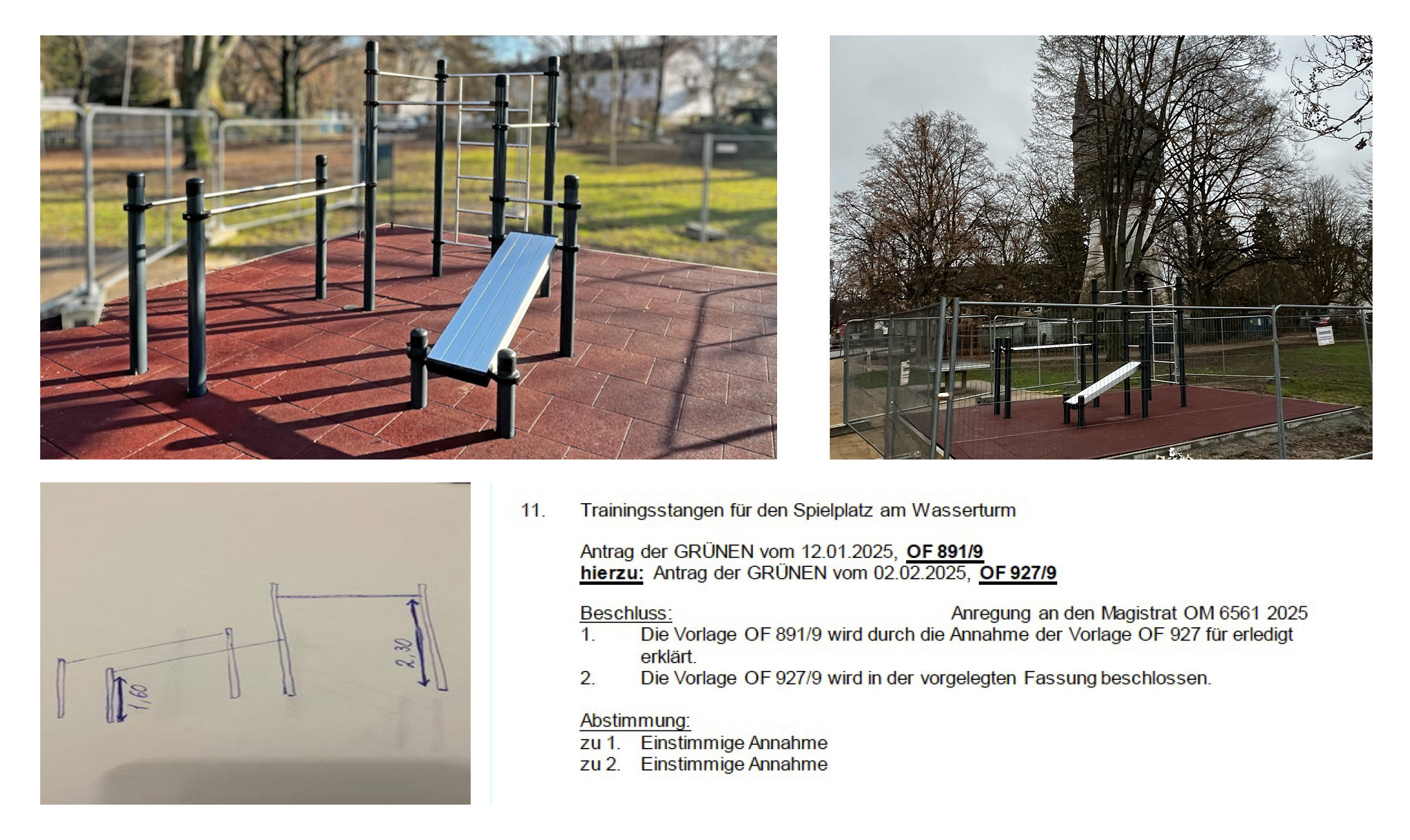 Bei der Gartenarbeit im Gemeinschaftsgarten Tortuga wurden wir häufig von Nachbarn darauf angesprochen, dass es sehr schade sei, dass in Eschersheim nirgends öffentliche Fitness-Geräte im Freien gäbe und dass der Spielplatz am Wasserturm ein idealer Ort dafür sei. Diese Anregung haben wir zusammen mit einer Skizze einer Calisthenics-Anlage, die ein Fitness-Coach aus der Nachbarschaft angefertigt hatte, an den Ortsbeirat weitergeleitet. Im Februar 2025 fasste der Ortsbeirat dann einstimmig den Beschluss: „Der Magistrat wird gebeten, am Spielplatz am Wasserturm Trainingsstangen für Erwachsene aufzubauen.“